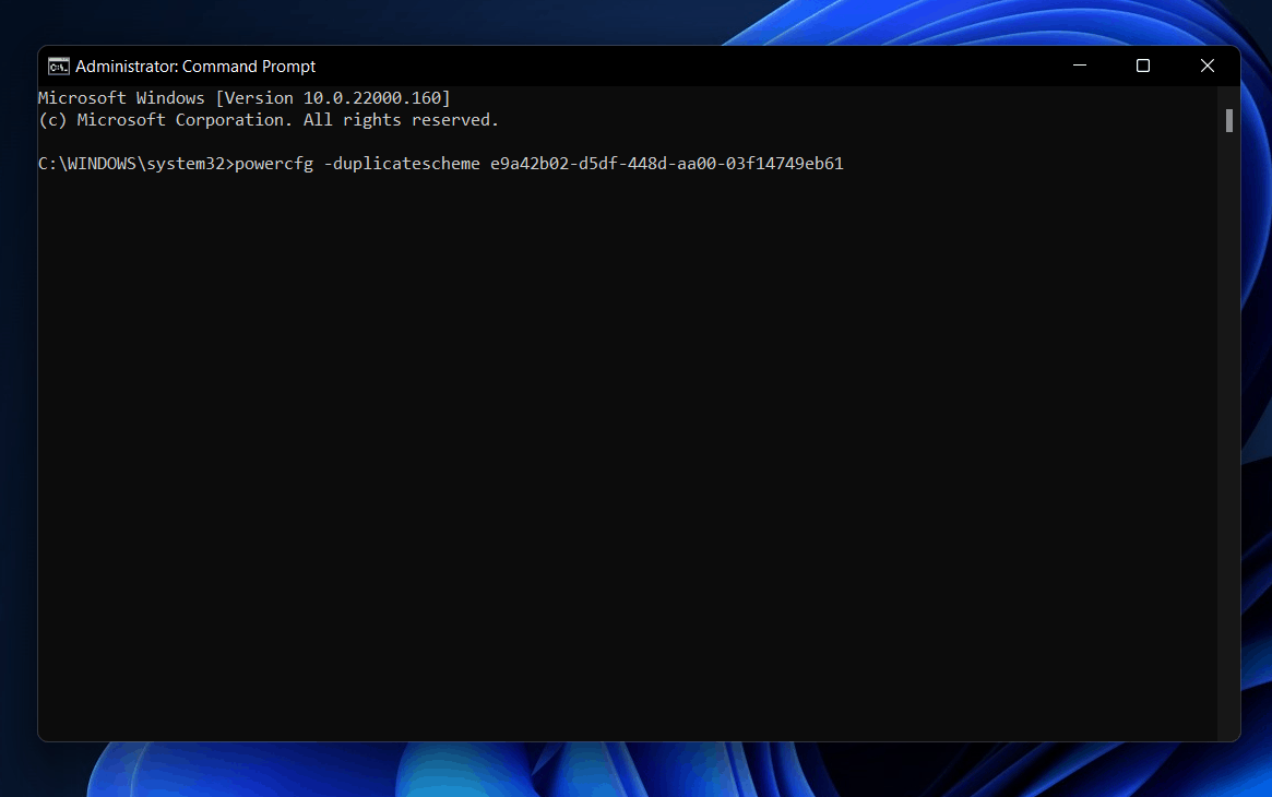 - Kirjoita komentokehotukseen seuraava komento-PowerCfg -Dulicatescheme E9A42B02-D5DF-448D-AA00-03F14749EB61ja lyödäTulla.