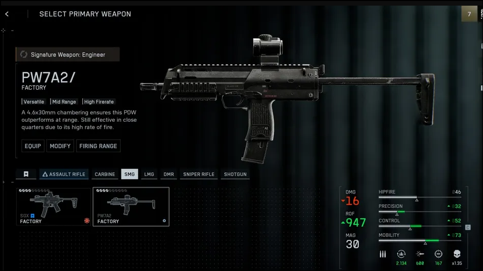 - PW7A2 (SMG):PW7A2 on ylimmän tason SMG, joka on huomattava sen poikkeuksellisesta liikkuvuudesta, korkeasta tulenopeudesta ja hallittavissa olevasta palautuksesta. Se toimii hyvin sekä lähivuosina että yllättävillä etäisyyksillä SMG: lle.
