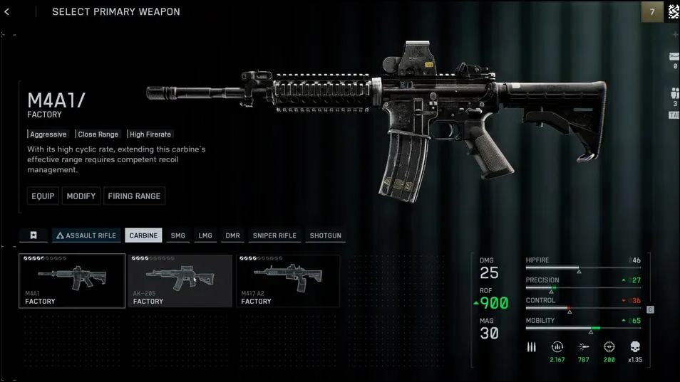 - M4A1 (karabiini):Suuri palo- ja vankka läheisen suorituskyvyn määrä M4A1 on ihanteellinen aggressiivisille leikkityyleille. Sen recoil vaatii kurinalaisen hallinnan, mutta se palkitsee ammattitaitoiset käyttäjät nopealla aikataululla.