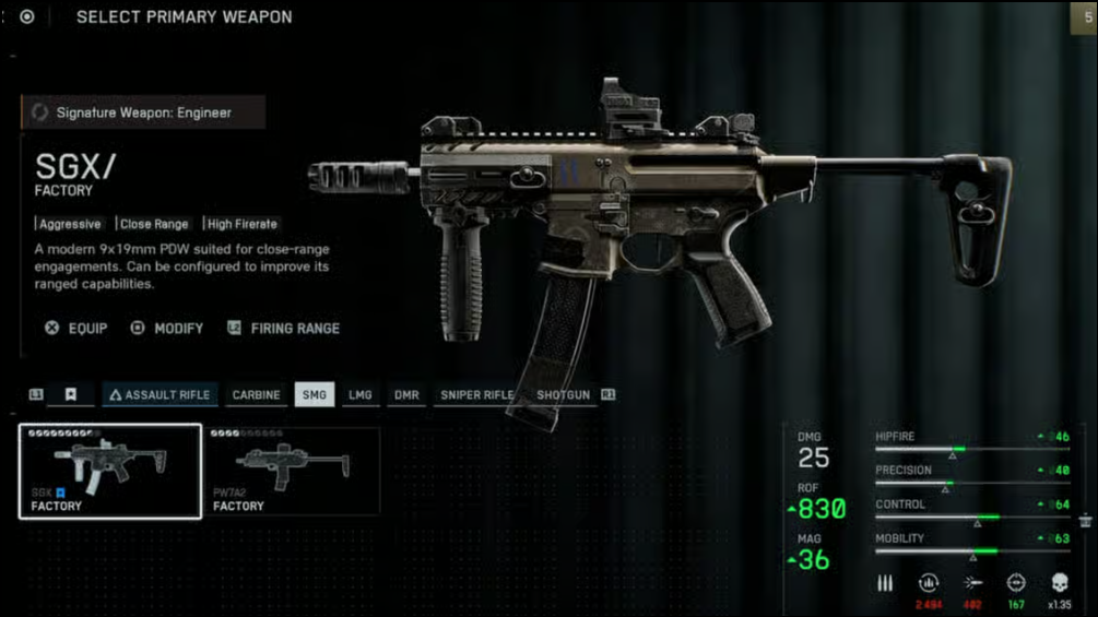 - SGX (SMG):SGX hallitsee lähi-aluetta taisteluita korkean tarkkuuden ja nopean tulipalonsa ansiosta. Sitä voidaan räätälöidä parempaan vaiheen suorituskykyyn, mutta paistaa kirkkaimpia tiukkoissa tiloissa.