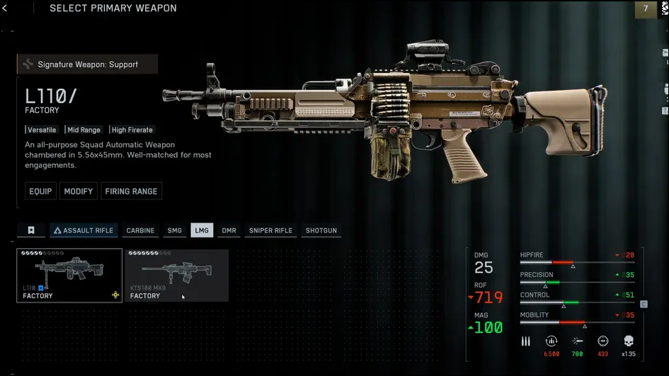 - L110 (LMG):Tämä kevyt konekivääri tasapainottaa tulivoiman ja lehden koon, mikä tekee siitä tehokkaan tukahduttavan tulipalon ja jatkuvien sitoutumisen kannalta.