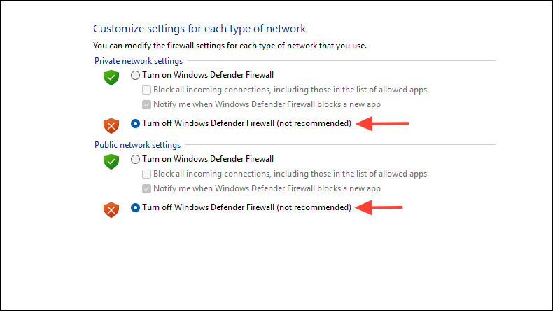 Vaihe 5:ValitaSammuta Windows Defender -palomuuri (ei suositella)Sekä yksityisille että julkisille verkoille. NapsauttaaHyväsäästää.