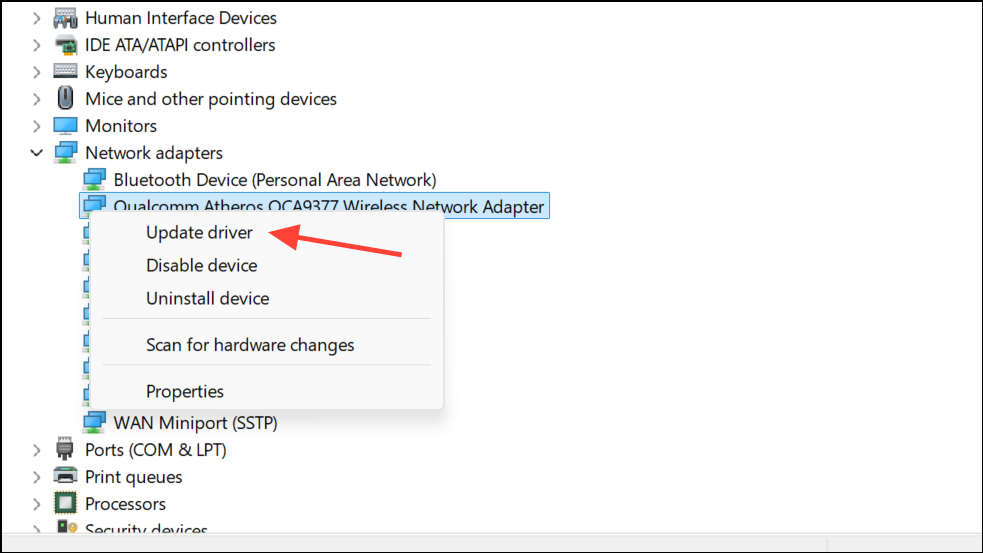 Vaihe 3:Napsauta hiiren kakkospainikkeella verkkosovitinta ja valitseUpdate driver. Sen sijaan, että luottaisit vain Windowsiin löytääksesi päivityksiä, käy kuitenkin laitteesi tai emolevyn valmistajan verkkosivustolla. Lataa viimeisin verkko -ohjain malli- ja käyttöjärjestelmäversiollesi.