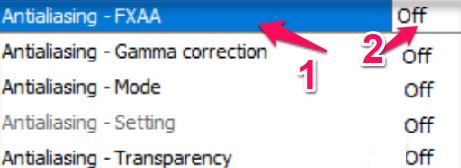 5. Valitse ”OFF” alla "Antialiasing-FXAA”Vaihtoehto.