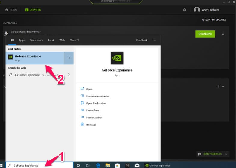 2. Sen jälkeen valitse hakutuloksista ”GeForce Experience”.