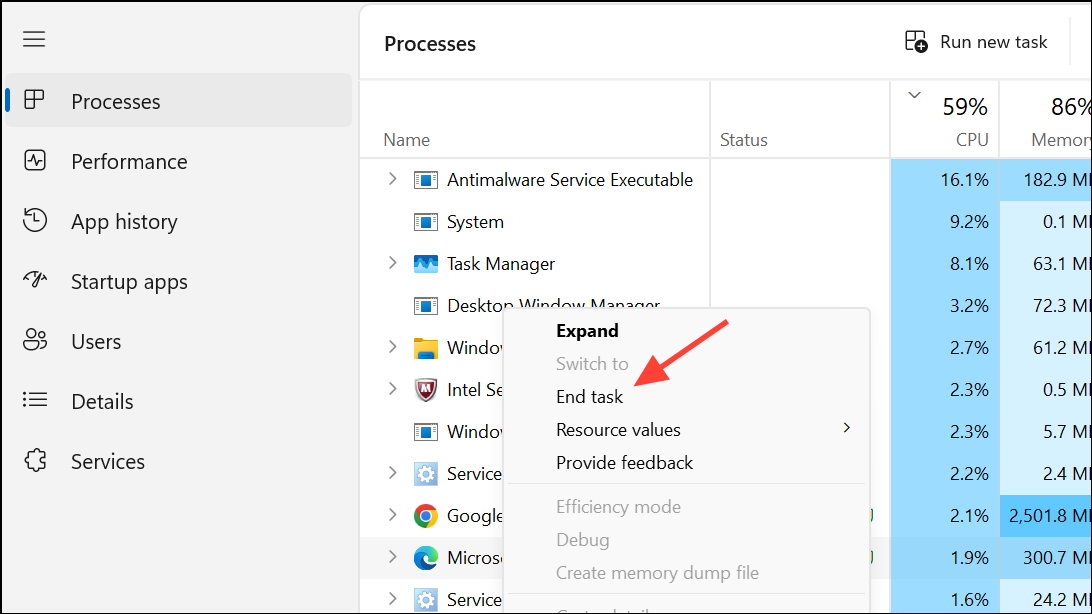 Vaihe 1:PainostaaCtrl + Shift + EscAvata tehtävähallinta. Jos haluat, napsauta hiiren kakkospainikkeella Windows-logoa ja valitseTehtäväpäällikkö.
