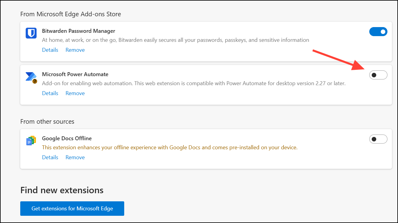 Ongelmalliset tai vanhentuneet laajennukset voivat olla ristiriidassa Edge -profiilijärjestelmän kanssa, mikä johtaa käynnistysvirheisiin. Kaikkien laajennusten poistaminen käytöstä auttaa tunnistamaan, aiheuttaako ongelman.
