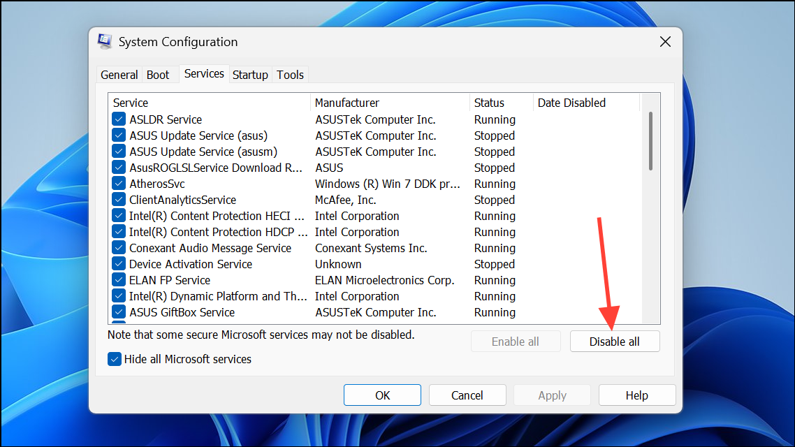 Vaihe 3:NapsauttaaPoista kaikki käytöstäKaikkien jäljellä olevien ei-Microsoft-palveluiden sammuttaminen. NapsauttaaSoveltaaMuutosten tallentaminen.