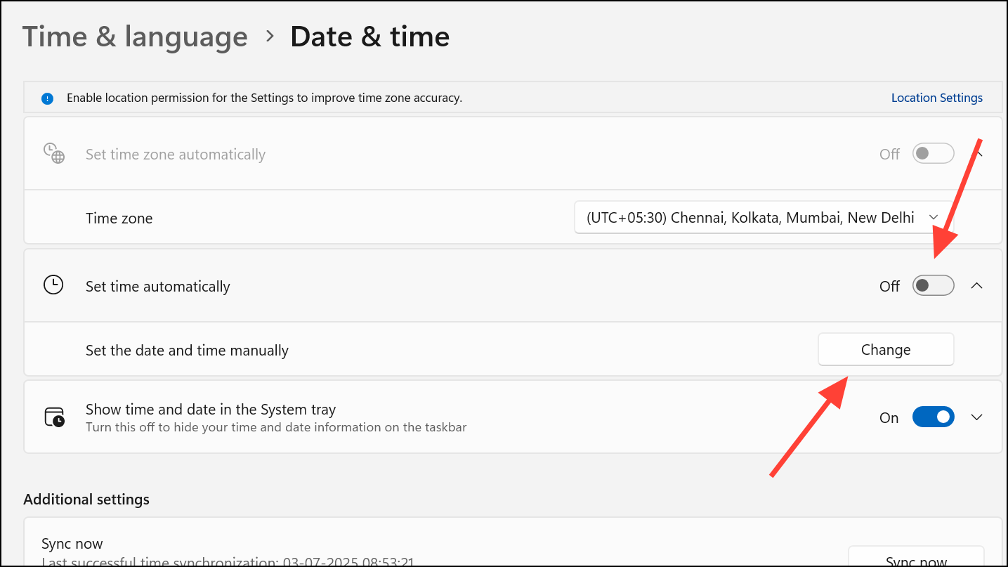 Vaihe 2:SammuttaaAseta aika automaattisesti, napsauta sittenMuuttaaaliAseta päivämäärä ja aika manuaalisesti. Kirjoita oikea päivämäärä ja aika ja napsautaMuuttaa.