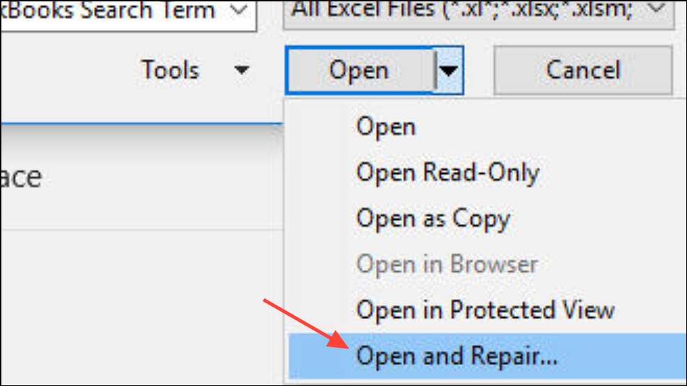 Korjaa tiedosto käyttämällä Excelin sisäänrakennettua ”avointa ja korjaus” -ominaisuutta