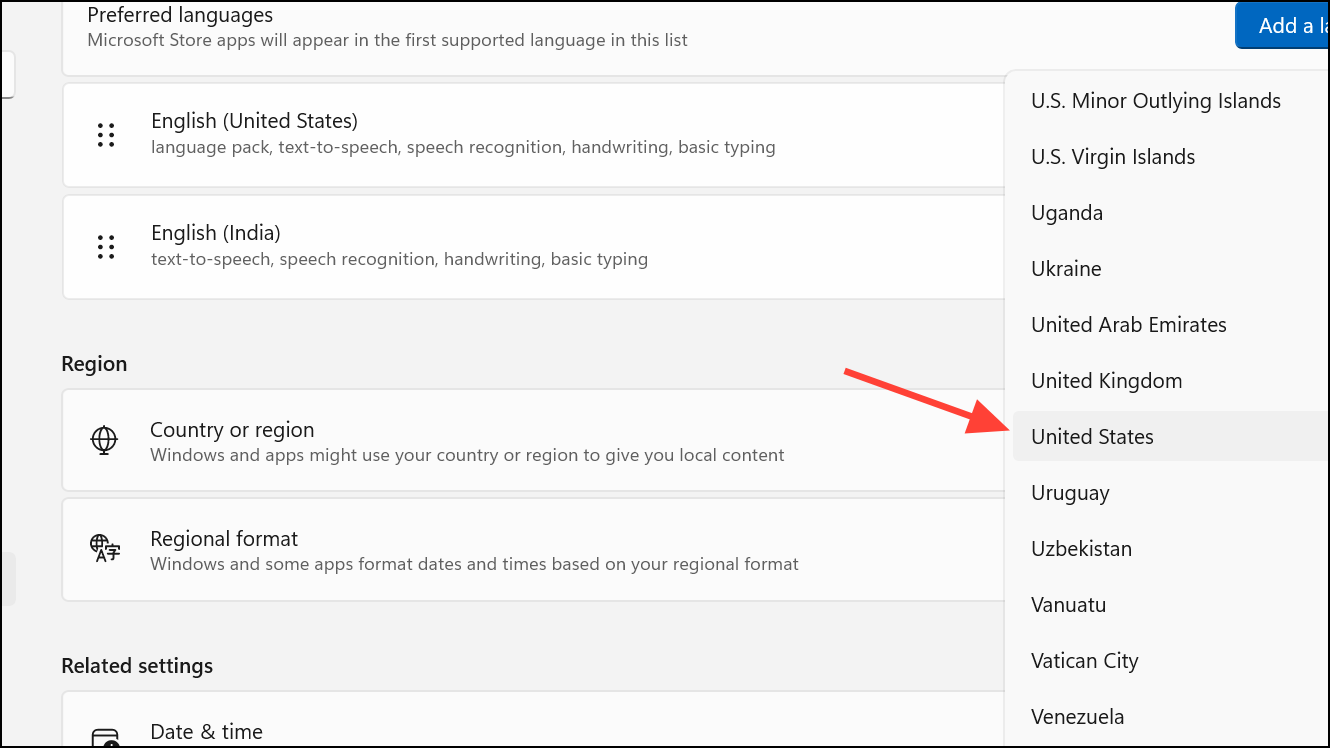 Vaihe 1:Siirry ikkunoissaAsetukset-Aika ja kieli-Kielen ja Alue.