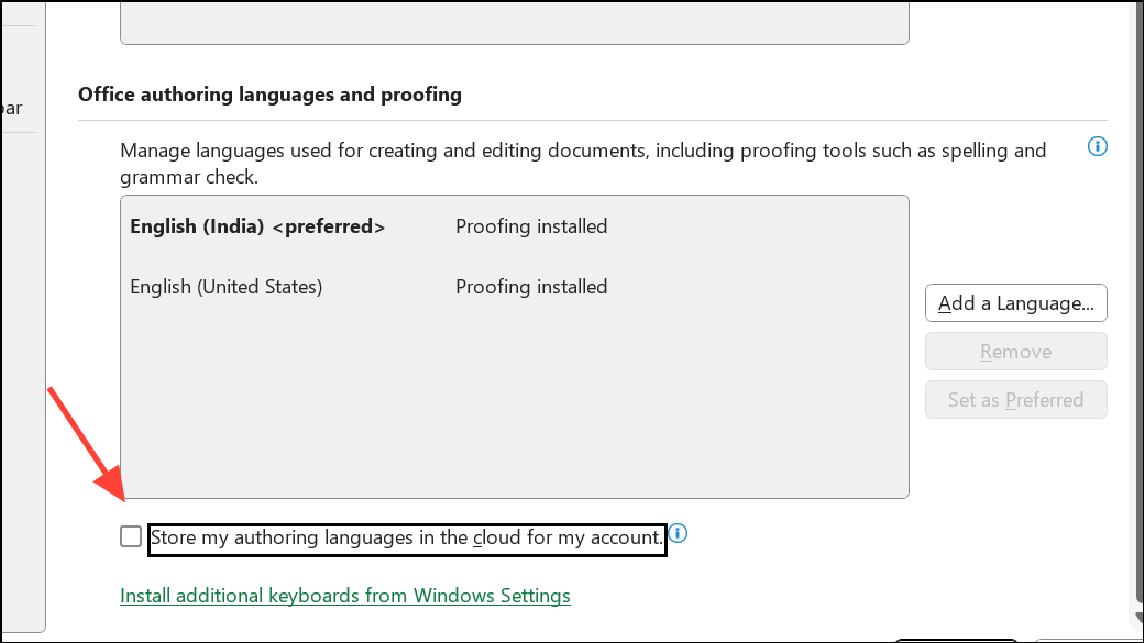 Vaihe 5:Jotkut käyttäjät ovat myös ratkaisseet ongelman poistamalla vaihtoehto käytöstä"Säilytä kirjoituskieleni pilvessä tilini"Excelin kielen asetukset.