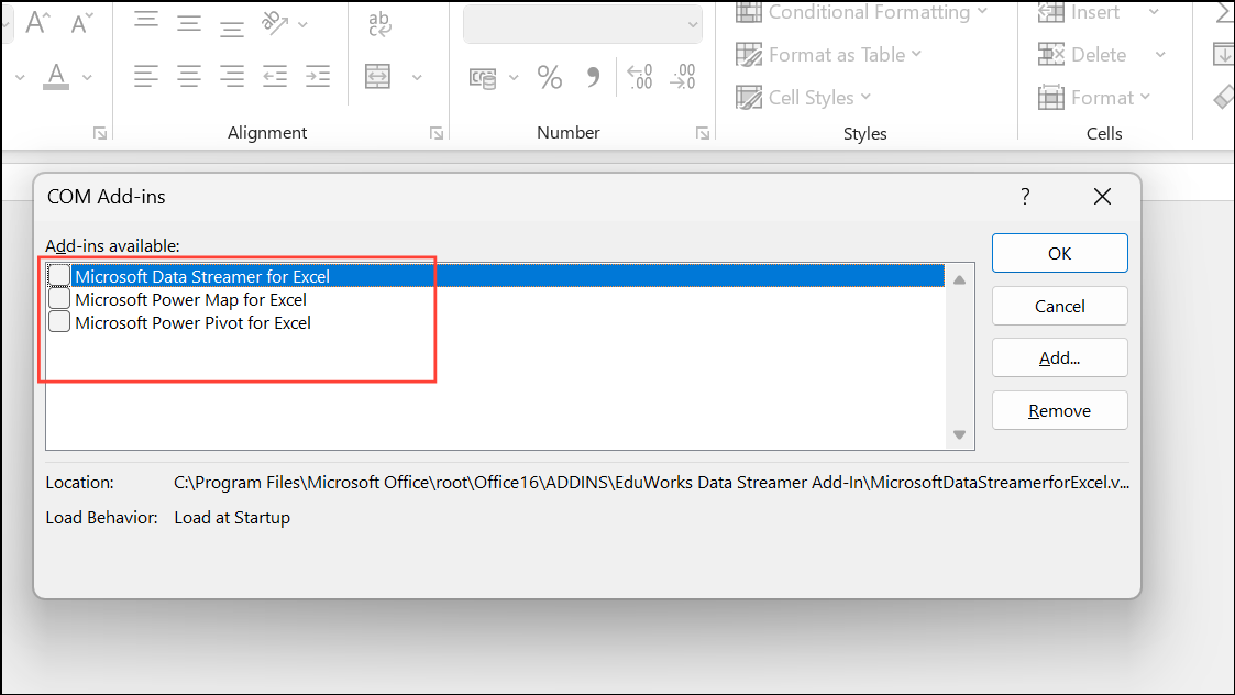 Vaihe 4:Poista kaikki lisäosat, napsautaHyvä, Käynnistä sitten Excel normaalitilassa. Uudelleensovellus lisätään yksi kerrallaan syyllisen tunnistamiseksi.
