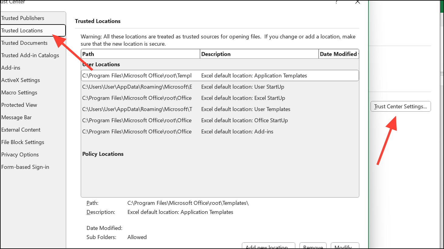 Vaihe 1:Excelissä meneTiedosto> Asetukset> Trust Center> Trust Center Asetukset> Luotetut paikatlöytää polkuXLSTARTkansio.