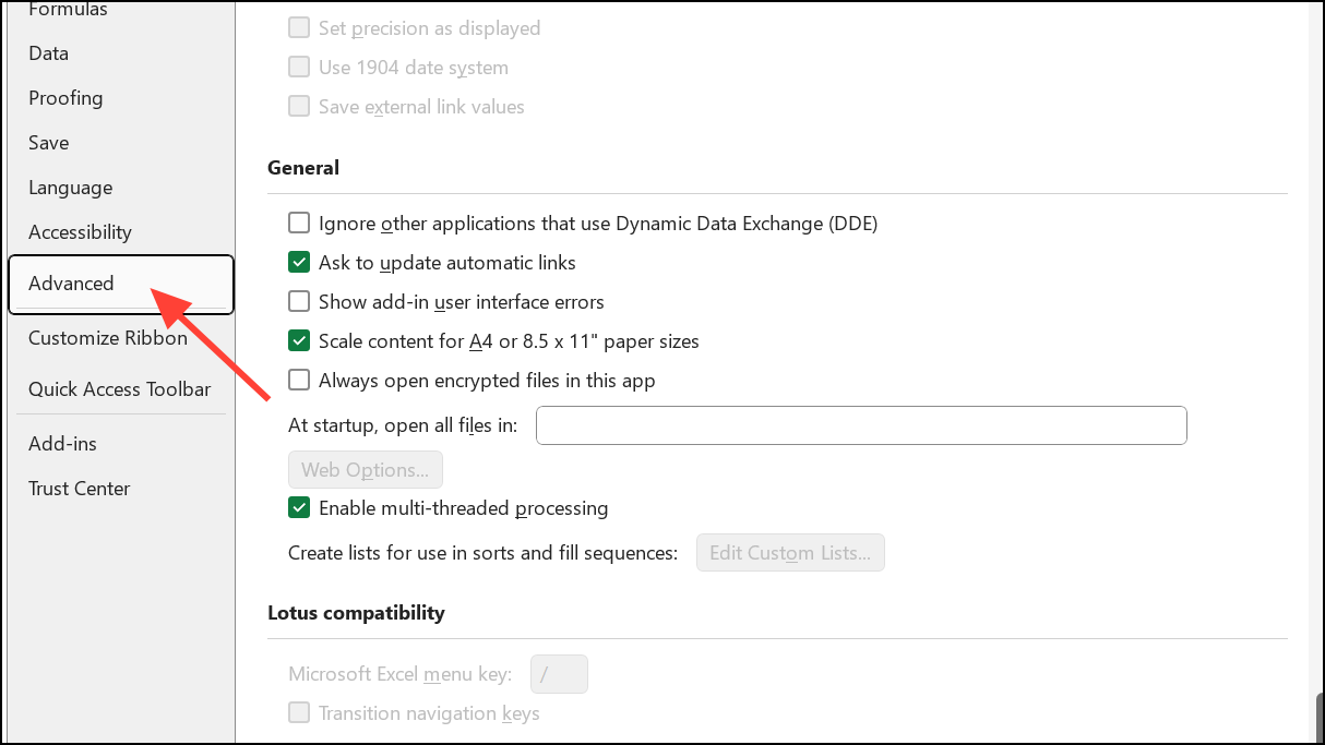 Vaihe 2:Siirrä kaikki tiedostot poisXLSTARTkansio ja kaikki vaihtoehtoiset käynnistyskansiot (sijaitsevatTiedosto> Asetukset> Edistynyt,Yleinenosa).