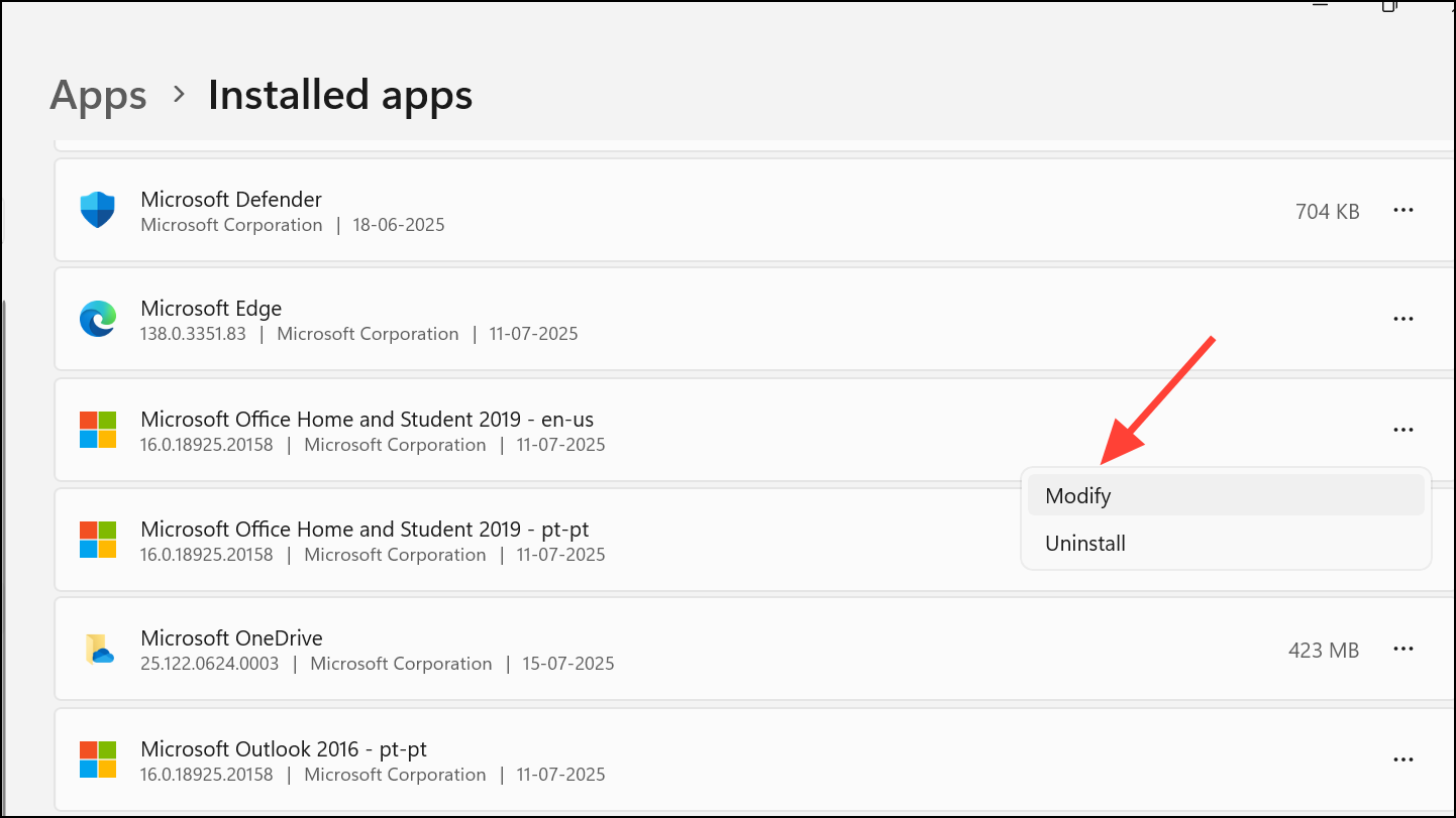 Vaihe 2:LöytääMicrosoft Officeluettelossa ja valitseMuuttaataiMuuttaa.