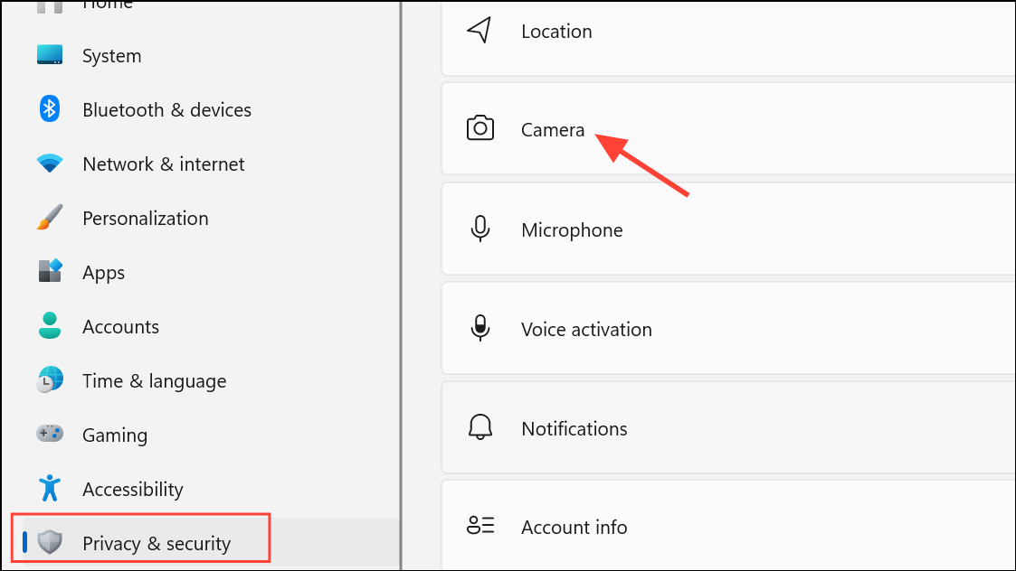 Vaihe 1:Windows 11: n yksityisyyden säätimet voivat estää kameran pääsyn sekä järjestelmän että kolmansien osapuolien sovelluksiin. Tarkastellaksesi näitä asetuksia siirtymälläStart > Settings > Privacy & security > Camera.