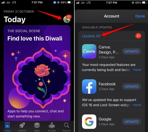 Jos se ei ole järjestelmä, joka on rakennettu buginen, yhdellä tai useammalla iPhoneen asennetulle sovellukselle voi olla jonkin verran teknistä ongelmaa, joka saa sinut kokemaan Ghost Touch -sovelluksen iPhonessa. Voit päivittää kaikki sovellukset uusimpaan versioon korjataksesi sen. Tehdä niin,