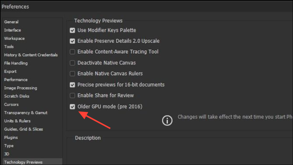Vaihe 1:Siirry PhotoshopissaEdit/Photoshop > Preferences > Performanceja napsauta ”Lisäasetukset”. Kokeile poistaa ”käytä OpenCL” tai ota käyttöön “Vanhempi GPU-tila (pre-2016)” -teknologian esikatselun alla. Nämä asetukset voivat parantaa vanhojen tai ongelmallisten GPU: ien vakautta.