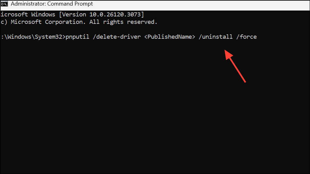 pnputil /delete-driver <PublishedName> /uninstall /forceKorvata<PublishedName>Kuljettajan todellinen julkaistun nimen kanssa, kutenoem58.inf. Käynnistä tietokone uudelleen, jotta Windows asentaa yhteensopivan ohjaimen uudelleen, jos laitetta tarvitaan.