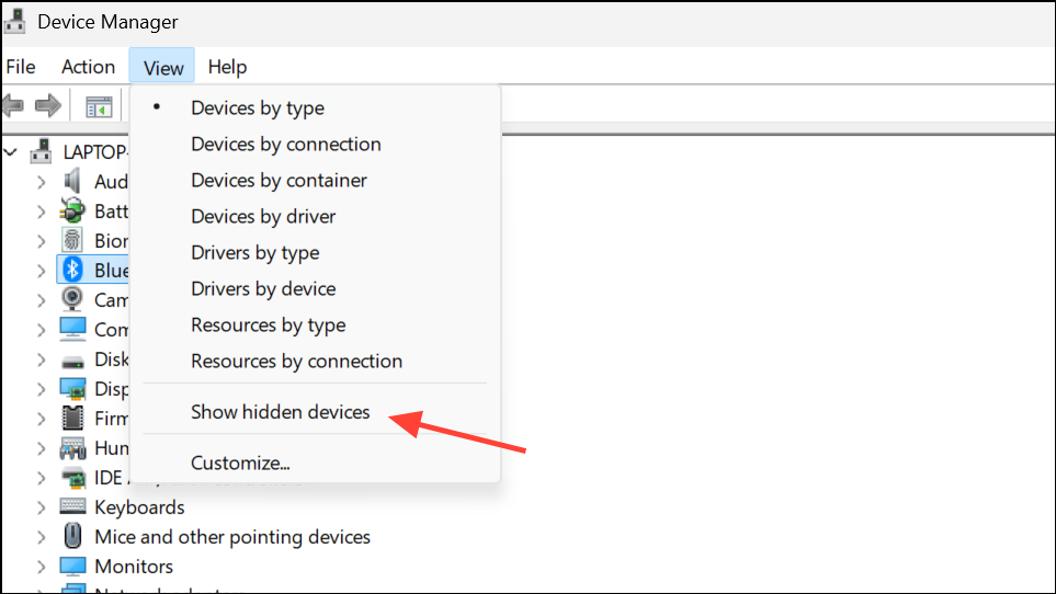 Vaihe 1:Jotkut kuljettajat, etenkin vanhojen tai poistettujen laitteistojen, voivat pysyä järjestelmässäsi ja aiheuttaa konflikteja. Avaa Device Manager, napsautaView > Show hidden devices. Etsi laitteita, joissa on haalistuneet kuvakkeet tai keltaiset varoitussymbolit.