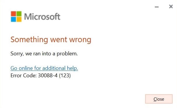 "Jotain meni pieleen virhekoodi 30088-4 Siirry verkkoon lisäapua."