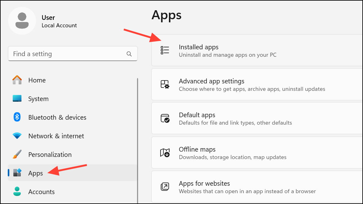 Vaihe 4:Poista asennussovellukset, joita käytät harvoin navigoimallaSettings > Apps > Installed Apps. Valitse sovellus ja valitse ”Poista asennus”.