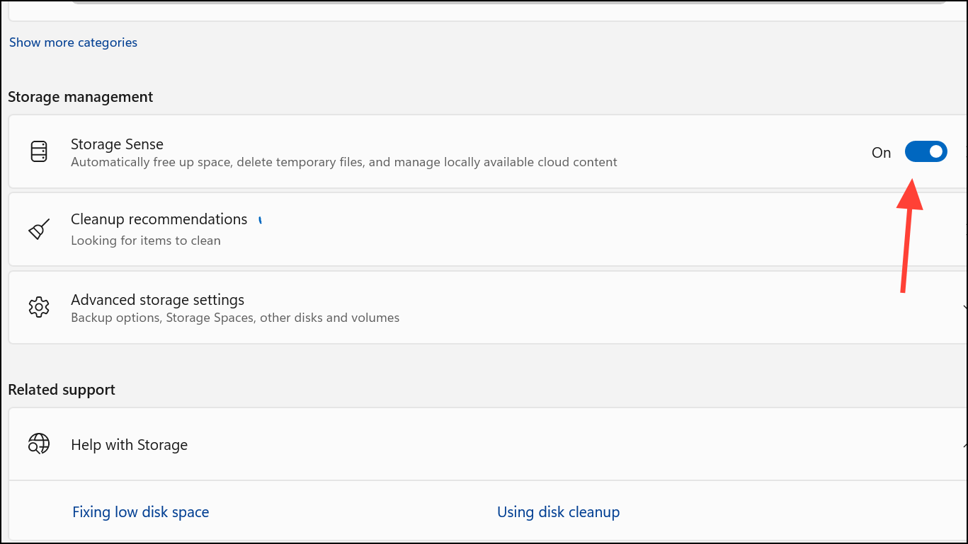 Vaihe 2:AvataSettings > System > Storageja ota tallennustilan käyttöön. Tämä ominaisuus poistaa käyttämättömät tiedostot automaattisesti, tyhjentää kierrätysastiat ja tyhjentää väliaikaiset tiedostot mieltymyksesi mukaan. Voit myös käyttää ”siivoussuosituksia” tarkistaaksesi suuria tai käyttämättömiä tiedostoja, pilveen syntyneitä tiedostoja ja käyttämättömiä sovelluksia poistoa varten.