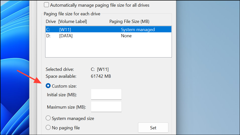Vaihe 3:Poista valinta "Hallitse automaattisesti kaikkien asemien hakutiedoston kokoa". Valitse C: asema, valitse ”Mukautettu koko” ja aseta pienempi arvo (kuten 512 Mt). Napsauta ”Set”, sitten “OK.” Käynnistä tietokone uudelleen, jotta muutokset tulevat voimaan.
