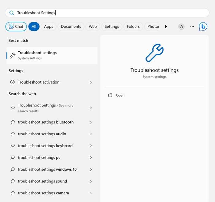 1. Kirjoita vianetsintäasetukset Windows 11 -haussa. AvaaVianmääritys Asetuksetparhaiden ottelutulosten luettelosta.