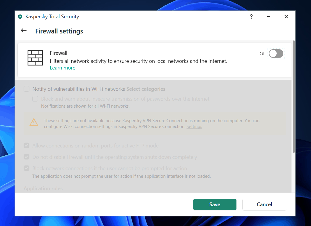 Jos sinulla on kuitenkin kolmannen osapuolen palomuurisovellusta tai jos käytät kolmansien osapuolien virustentorjuntaohjelmistoja palomuurilla, se hallitsee tietokoneesi palomuuriasetuksia. Poista kolmannen osapuolen palomuuri ja virustentorjunta-sovellus käytöstä, etkä enää kohtaa asiaa.