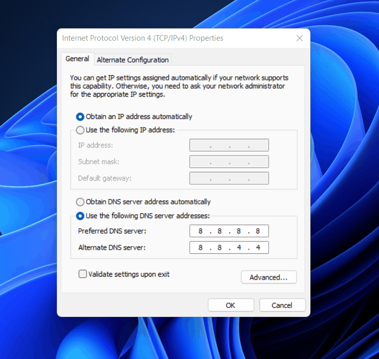 - Anna nytensisijainen DNS -palvelinkun8.8.8.8ja kirjoitaVaihtoehtoinen DNS -palvelinkun8.8.4.4.