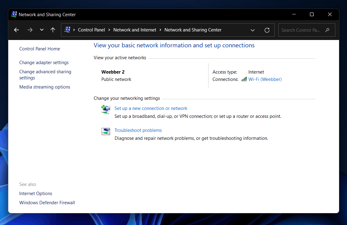 - SiinäOhjauspaneeli,napsauttaaVerkko ja Internetja napsauta sittenVerkko- ja jakamiskeskus.