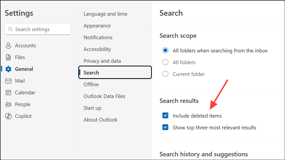 Vaihe 3:Jos poistetut kohteet puuttuvat hakutuloksista, varmistaInclude deleted itemsvaihtoehto tarkistetaanSearch resultsSamassa valikossa. Tämän asetuksen tallentaminen laajentaa haun kattavuutta poistettuihin kohteiden kansioon.