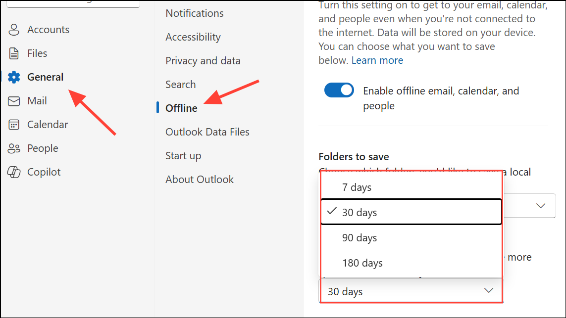 Vaihe 4:Lisää etsimään käytettävissä olevien sähköpostien valikoimaa, siirry osoitteeseenSettings > General > Offlineja säätääDays of email to savepidemmälle ajanjaksolle. Tämä lataa enemmän historiallisia sähköposteja paikalliselle indeksoinnille, jotka voivat ratkaista ongelmat, joissa haut kaipaavat vanhempia viestejä.