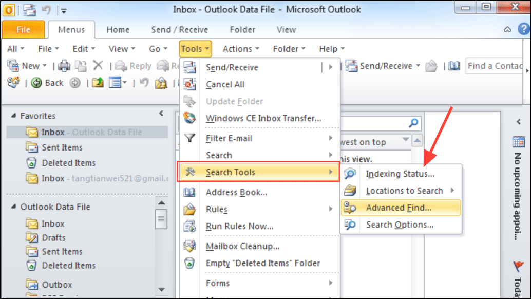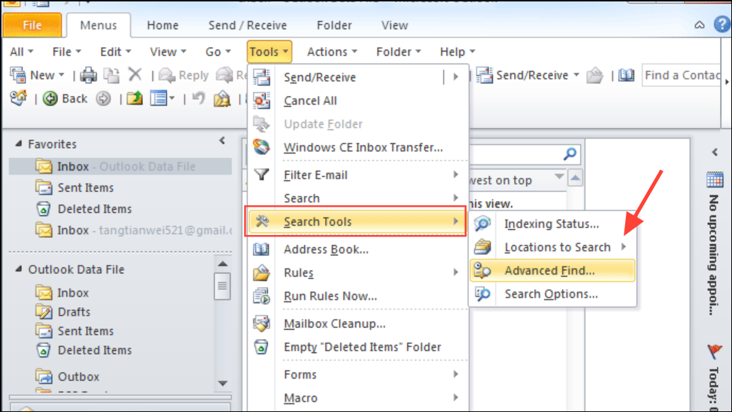 Vaihe 2:Valitse seuraavaksiSearch Tools > Locations to Searchja varmista, että kaikki asiaankuuluvat tietotiedostot on tarkistettu. Jos pää postilaatikkoa tai arkistoa ei ole valittu, Outlook ei etsi niitä.