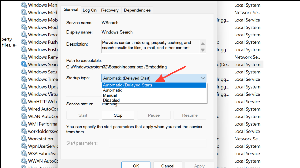 Vaihe 2:Luettelosta löydäWindows Search, kaksoisnapsauta sitä ja asetaStartup type-llaAutomatic (Delayed Start). Jos palvelu ei ole käynnissä, napsautaStartaktivoida se. Tämä varmistaa, että haku -hakemisto on aina saatavana Outlookiin.