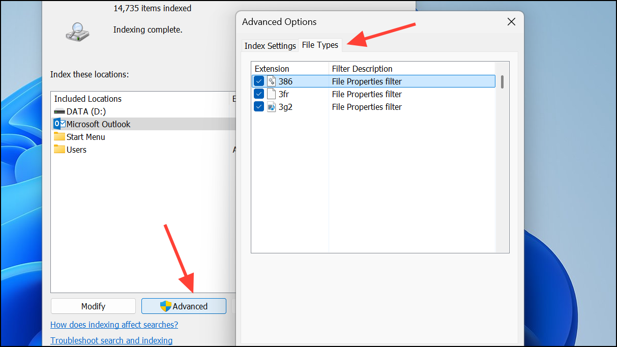 Vaihe 3:Sisä-Indexing OptionsValitseAdvanced, sittenFile Typesvälilehti.