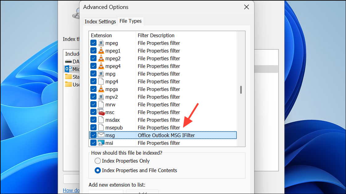 Vaihe 4:Vierittää jtkmsgja varmistaaIndex Properties and File Contentson käytössä. Tämä asetus antaa Outlookin etsiä viestin sisältöä, ei vain otsikoita.