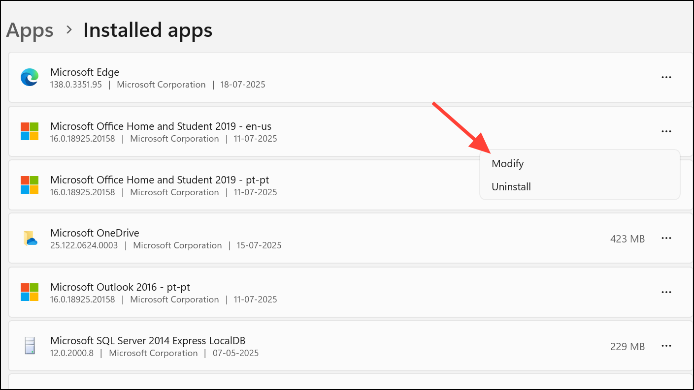 Vaihe 2:Etsi Microsoft Office, valitseModifyja valitseOnline Repairkattava korjaus. Noudata näytön ohjeita. Tämä prosessi korjaa vioittuneita ohjelmatiedostoja, jotka saattavat vaikuttaa Outlookin hakuun.
