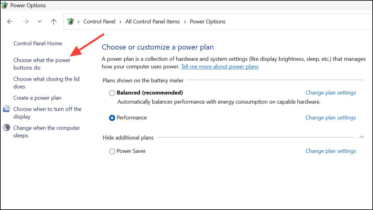 Vaihe 1:Avaa ohjauspaneeli ja siirry kohtaanPower Options. NapsauttaaChoose what the power buttons dovasemmalla sivupalkissa.