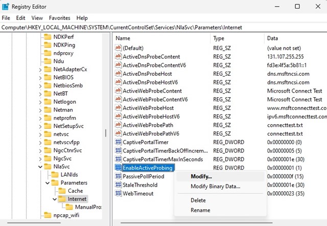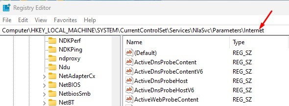 ComputerHKEY_LOCAL_MACHINESYSTEMCurrentControlSetServicesNlaSvcParametersInternet
