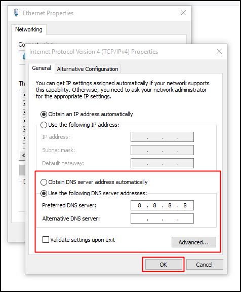 5. Kirjoita Preferred DNS Server -kohtaan8.8.8.8; Kirjoita vaihtoehtoiseen DNS-palvelimeen8.8.4.4. Kun olet valmis, napsautaOK.