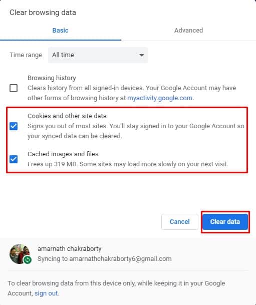 Siirry kohtaan Asetukset> Lisäasetukset. Napsauta Lisäasetuksissa Tyhjennä selaustiedot. Valitse luettelosta välimuisti ja evästeet ja napsauta sitten Tyhjennä selaustiedot. Kun olet valmis, käynnistä selain uudelleen korjataksesi "Mediaa ei voitu ladata, koska muotoa ei tueta" -virhesanoma.