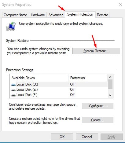 - Napsauta järjestelmän ominaisuuksiaJärjestelmänsuojausvälilehti.
