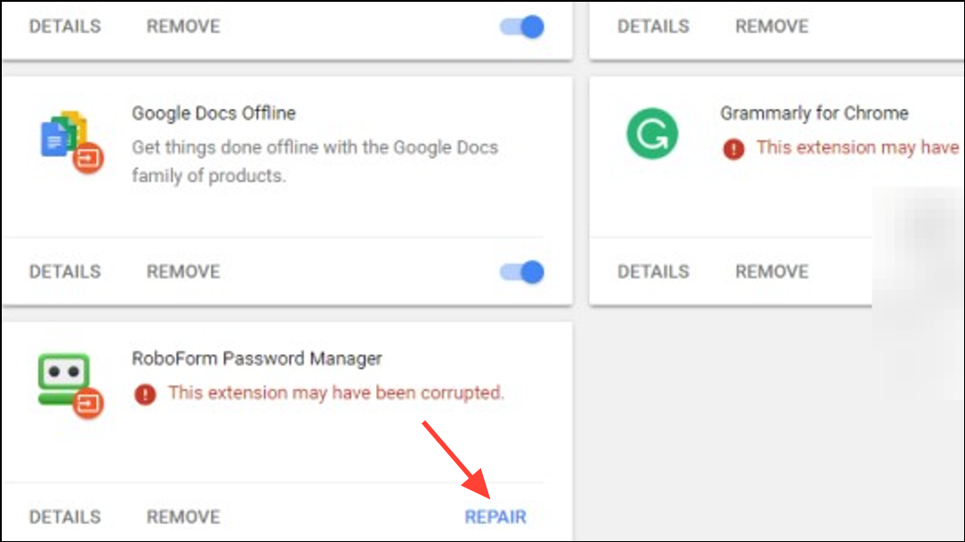 Vaihe 2:Etsi laajennus, joka on merkitty "korruptoituneeksi". Näet varoituksen ja aRepairPainike sen vieressä. NapsauttaaRepairpainike. Chrome lataa automaattisesti tuoreen kopion laajennuksesta Chrome Web Storesta ja asenna se uudelleen korvaamalla kaikki vaurioituneet tiedostot.