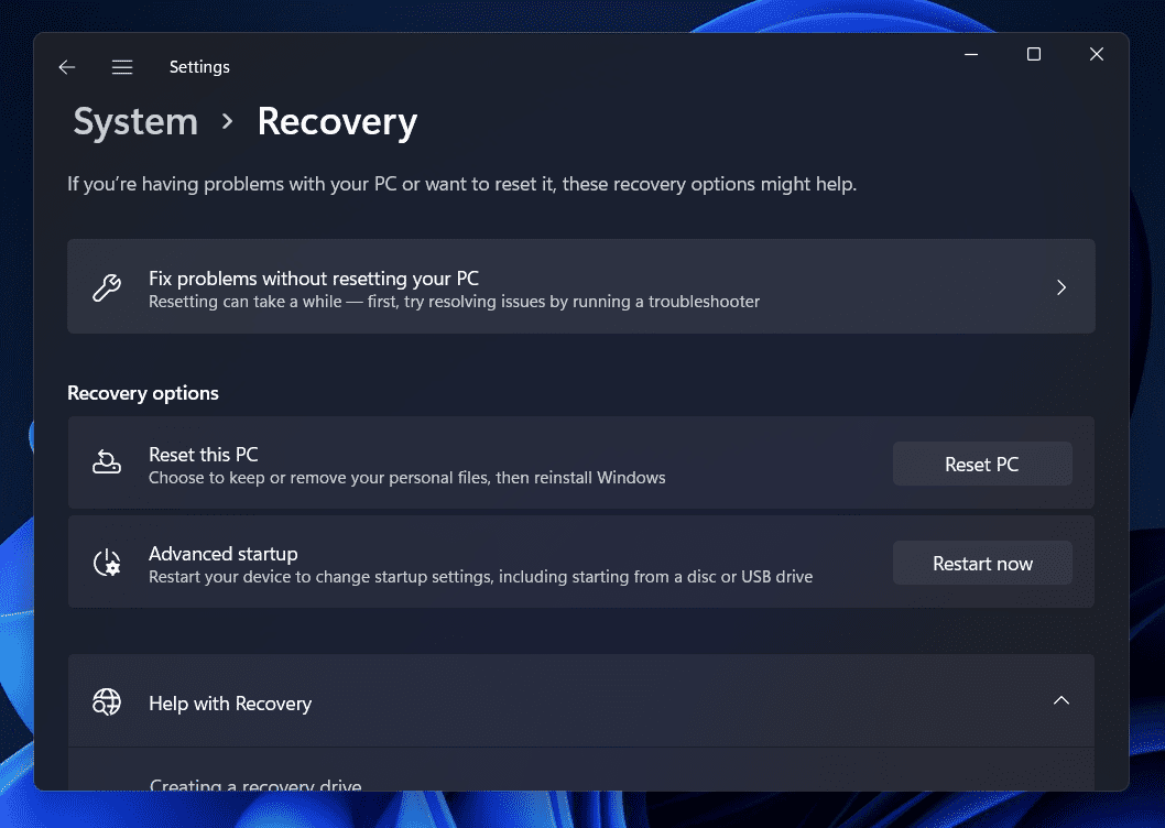 - Oikealla puolellaJärjestelmäTAB, napsautasePalautusvaihtoehto.
