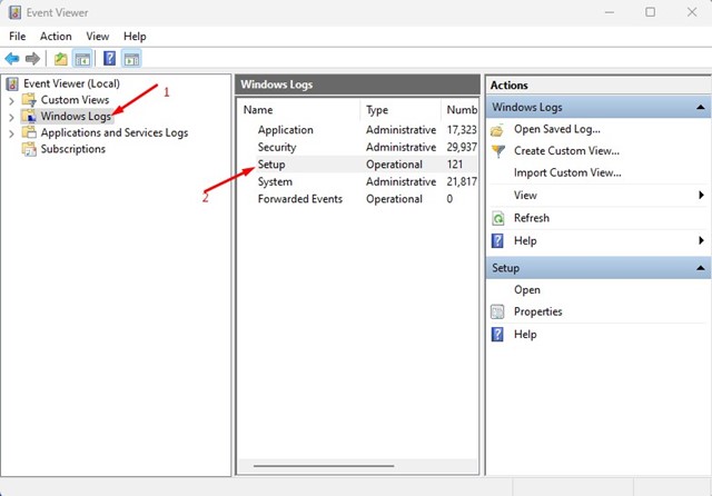 2. Navigoi seuraavalle polulleWindows-lokit > Asennus.