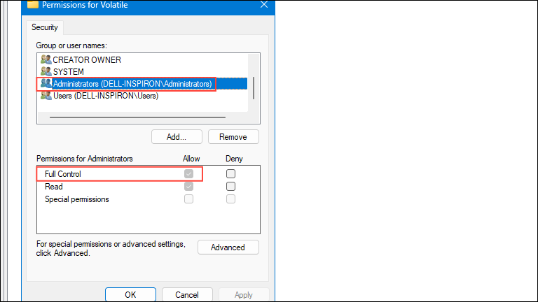 Vaihe 3:Napsauta hiiren kakkospainikkeellaVolatileavain ja valitseKäyttöoikeudet. Varmistaa, ettäJärjestelmäjaYlläpitäjätryhmillä onTäysi hallintakäyttöoikeudet. Riittämättömät käyttöoikeudet estävät Windows -asetusprosessin lukemasta tai päivittämästä asennuksen etenemistä aiheuttaen päivityksen epäonnistumisen noin 11%: lla virheellä 0xc1900204.