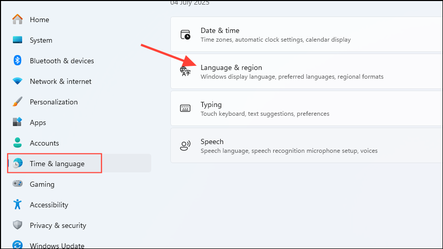 Vaihe 1:Useat kielipakkaukset tai sopimaton järjestelmäpaikat voivat häiritä päivitysprosessia. Mennä jhkAsetukset-Aika ja kieli-Kieli- ja alueja tarkista asennetut kielet. Poista tarpeettomat kielipakkaukset ja aseta ensisijainen kielesi oletuksena.